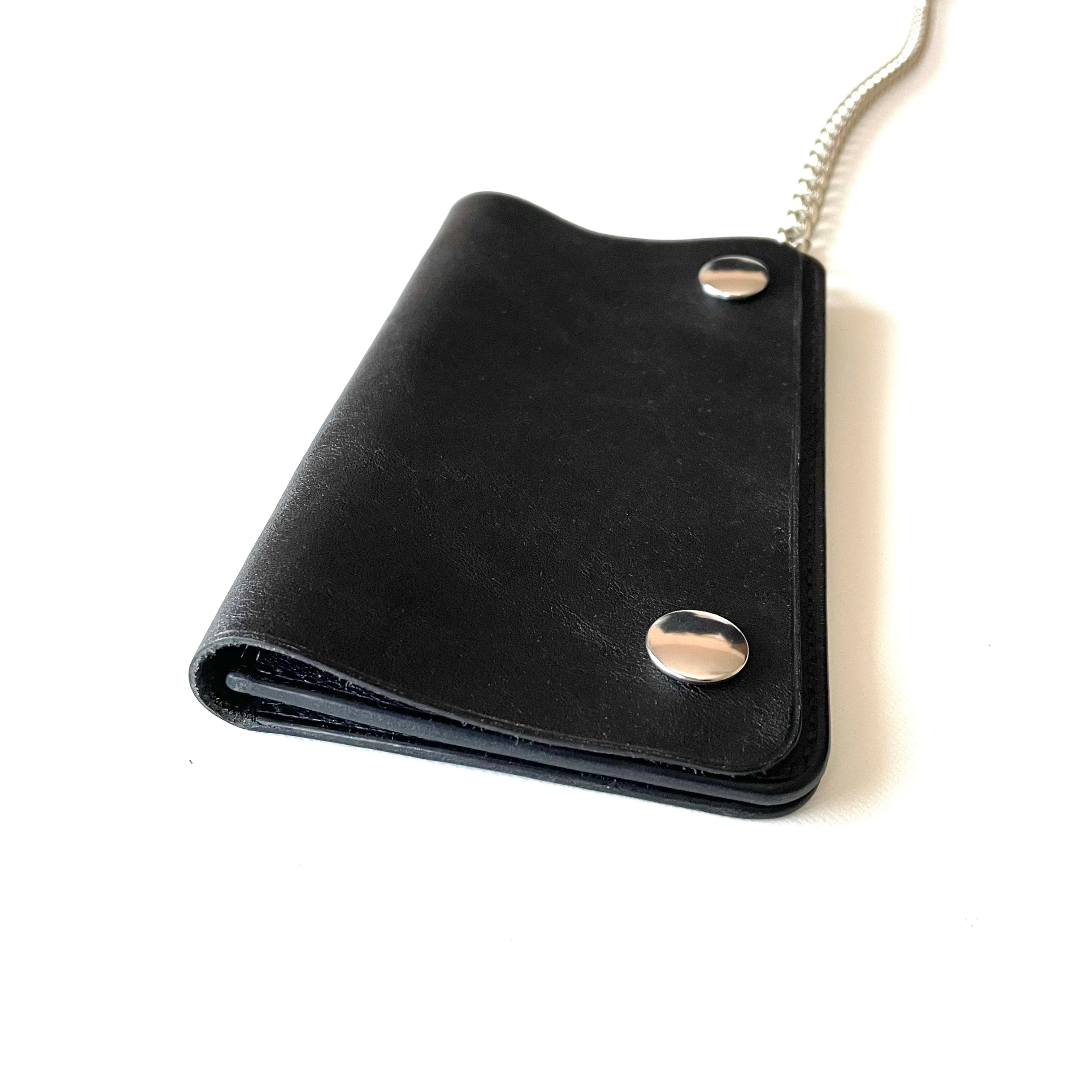 チェーンは鉄製マンテルチェーン。線径2.5mm、幅約9mm、一コマづつロウ付けされていて非常に堅牢です。ロウ付け鉄製チェーンを使ったトラッカーウォレットはほぼないのでおすすめです。メッキも滑らかで美しい質感です。