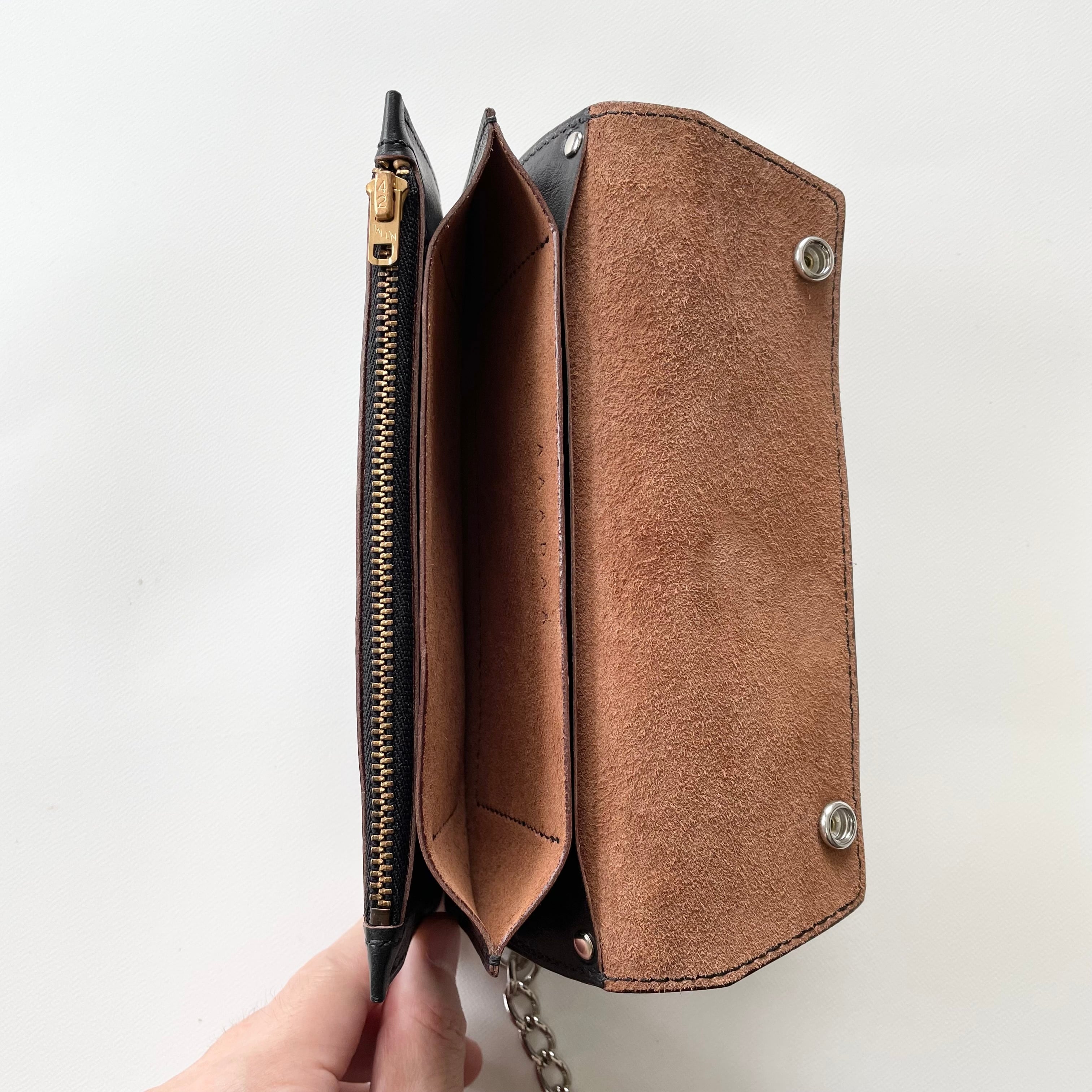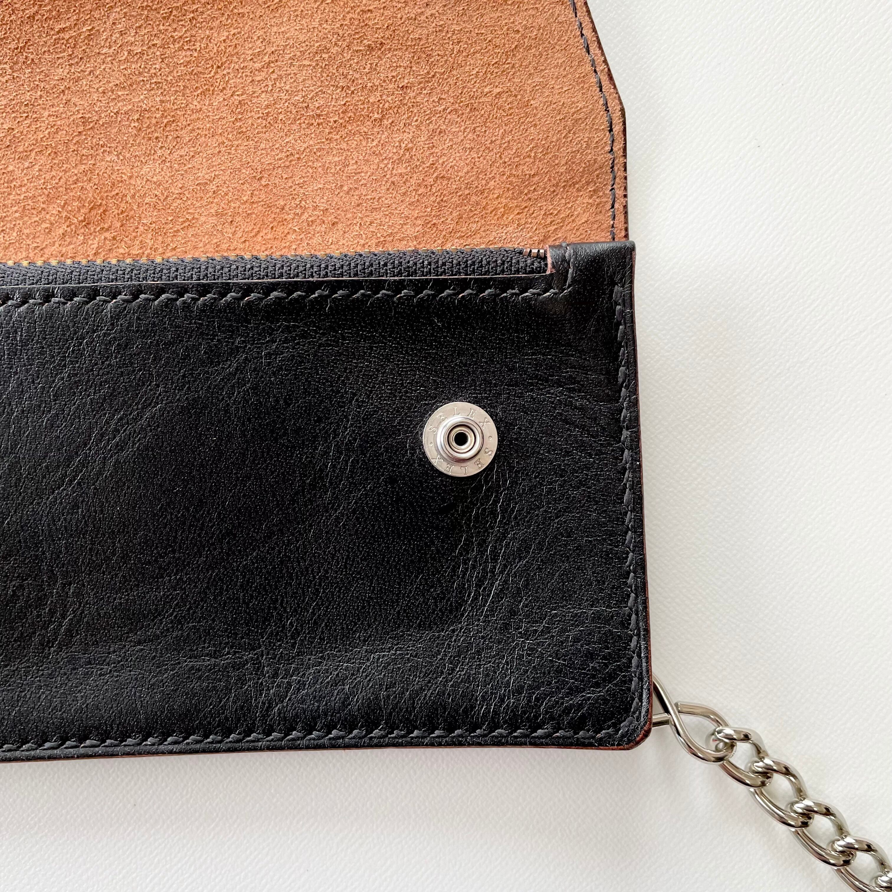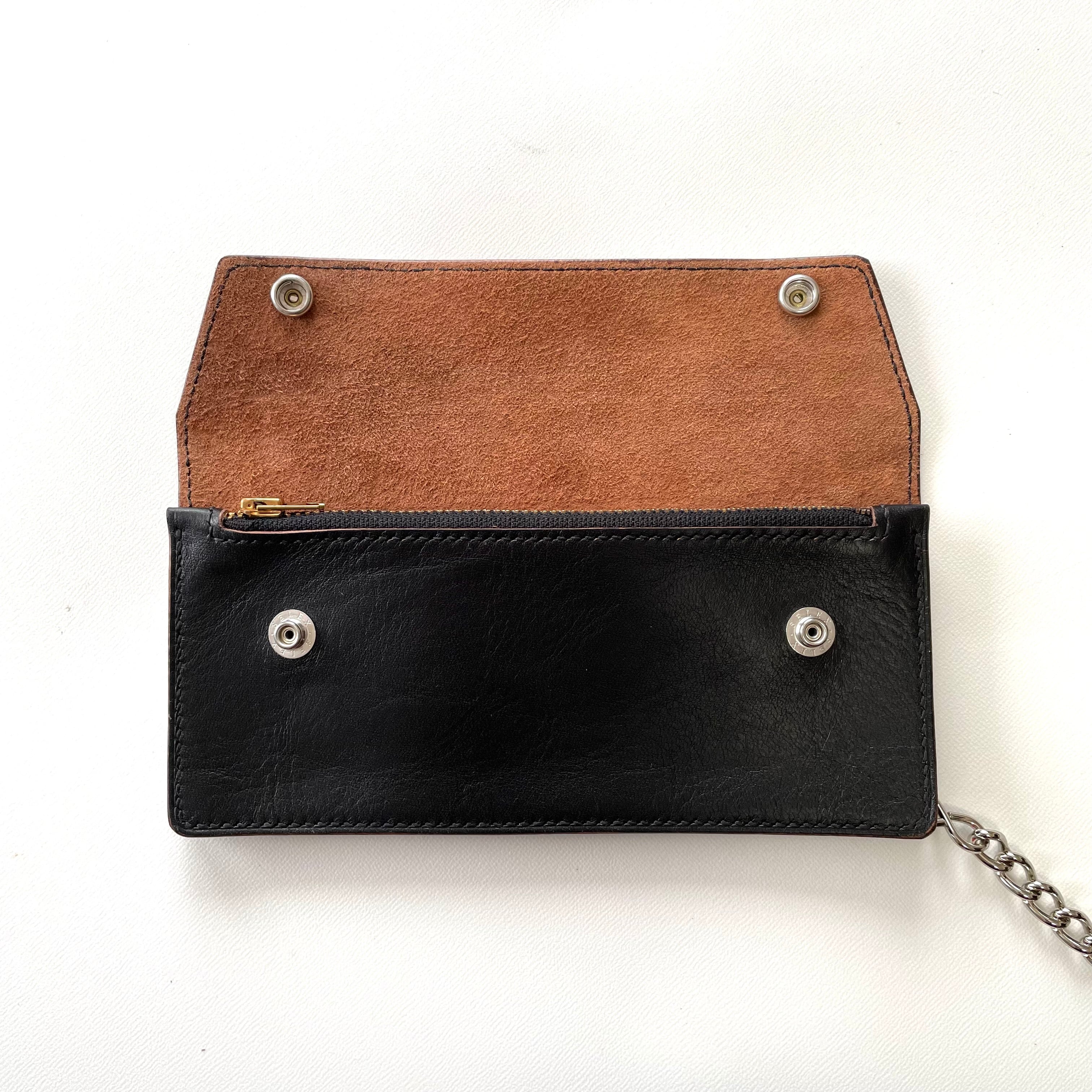 チェーンは鉄製マンテルチェーン、線径2.5mm、幅約9mm、一コマづつロウ付けされていて非常に堅牢です。ロウ付け鉄製チェーンを使ったトラッカーウォレットはほぼないのでおすすめです。メッキも滑らかで美しい質感です。